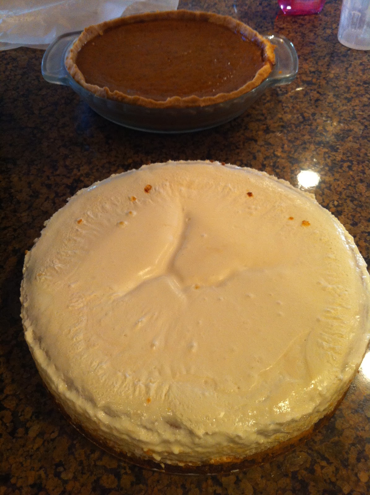 Final product, after baking lengthily, sitting in the oven for a half hour, cracking during oven-cooling, receiving its sour cream topping, then baking at 400 for 9.3 minutes (amount my compulsion dictates.) Ohhhh yeahhhhhh. (The pumpkin pie at the top has an inferiority complex and is trying to sneak into the picture. Sad.)