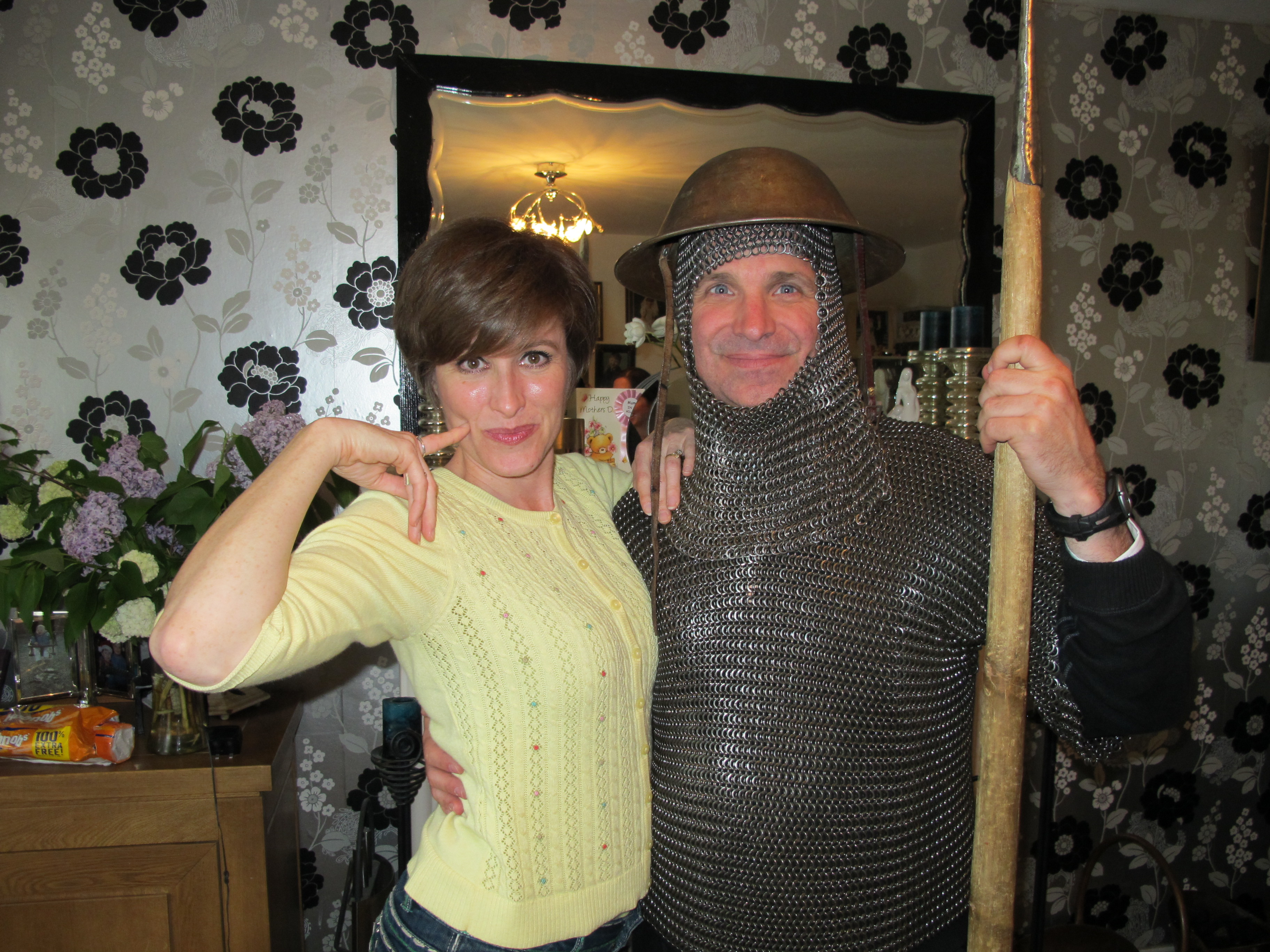 Irish knight, with pike and World War II helmet. Chick in a yellow sweater.