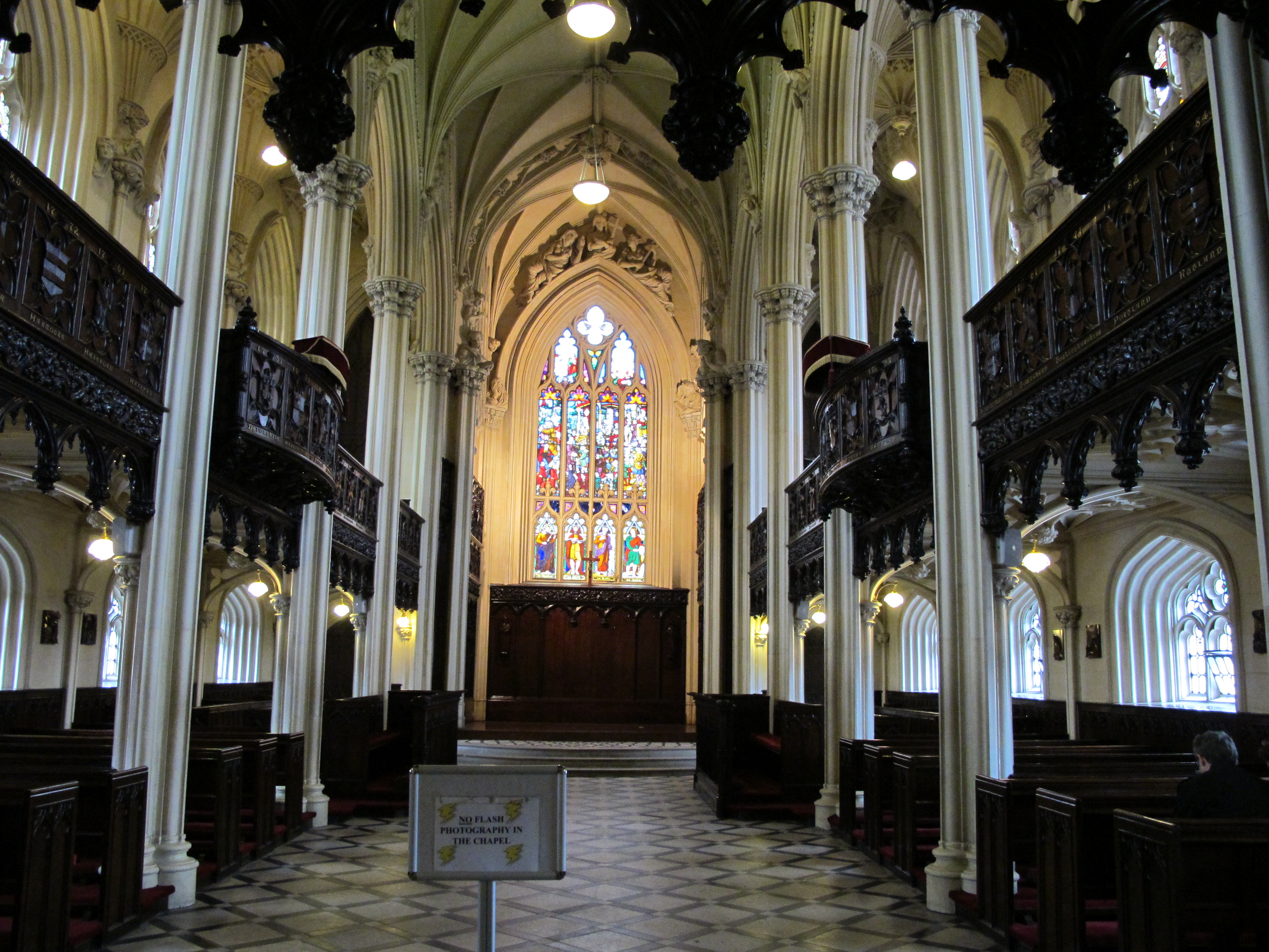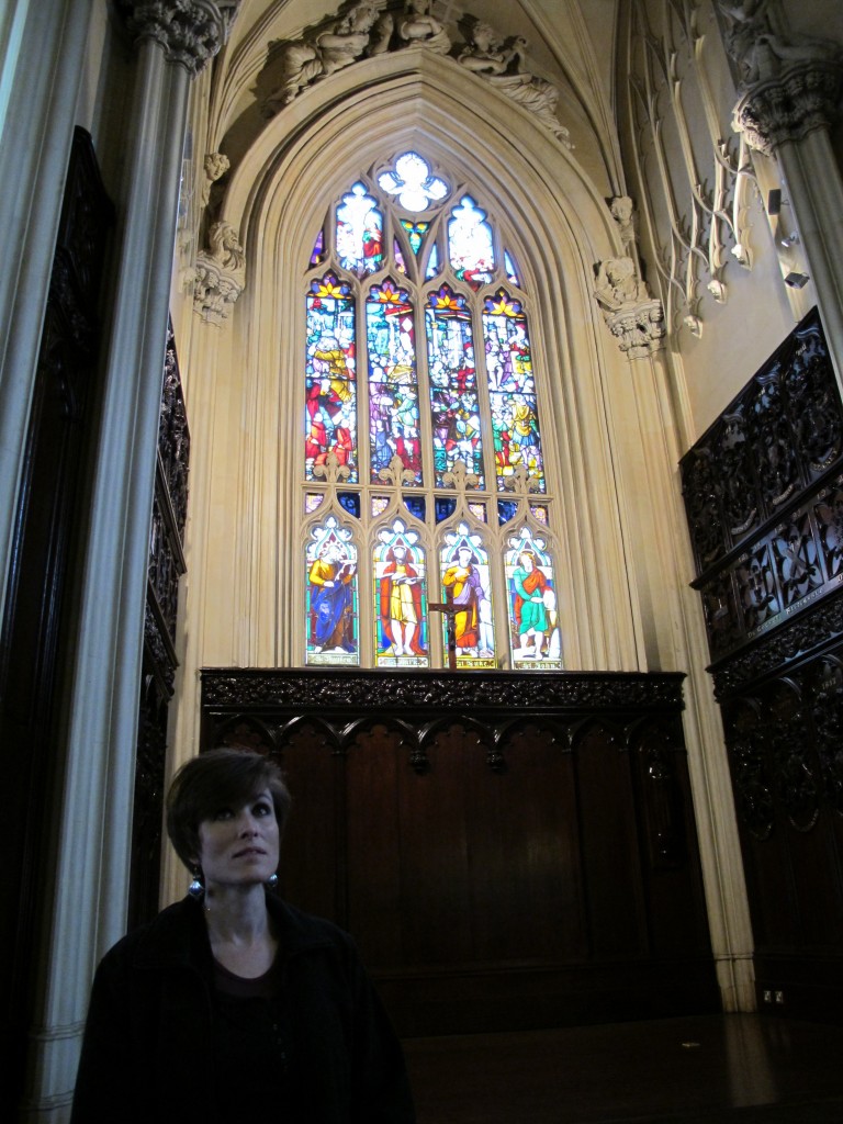 Inner courtyard of Christchurch Cathedral on Easter Sunday. Punctual worshippers on the inside, jet-lagged stragglers on the outside. Love the flower windows.