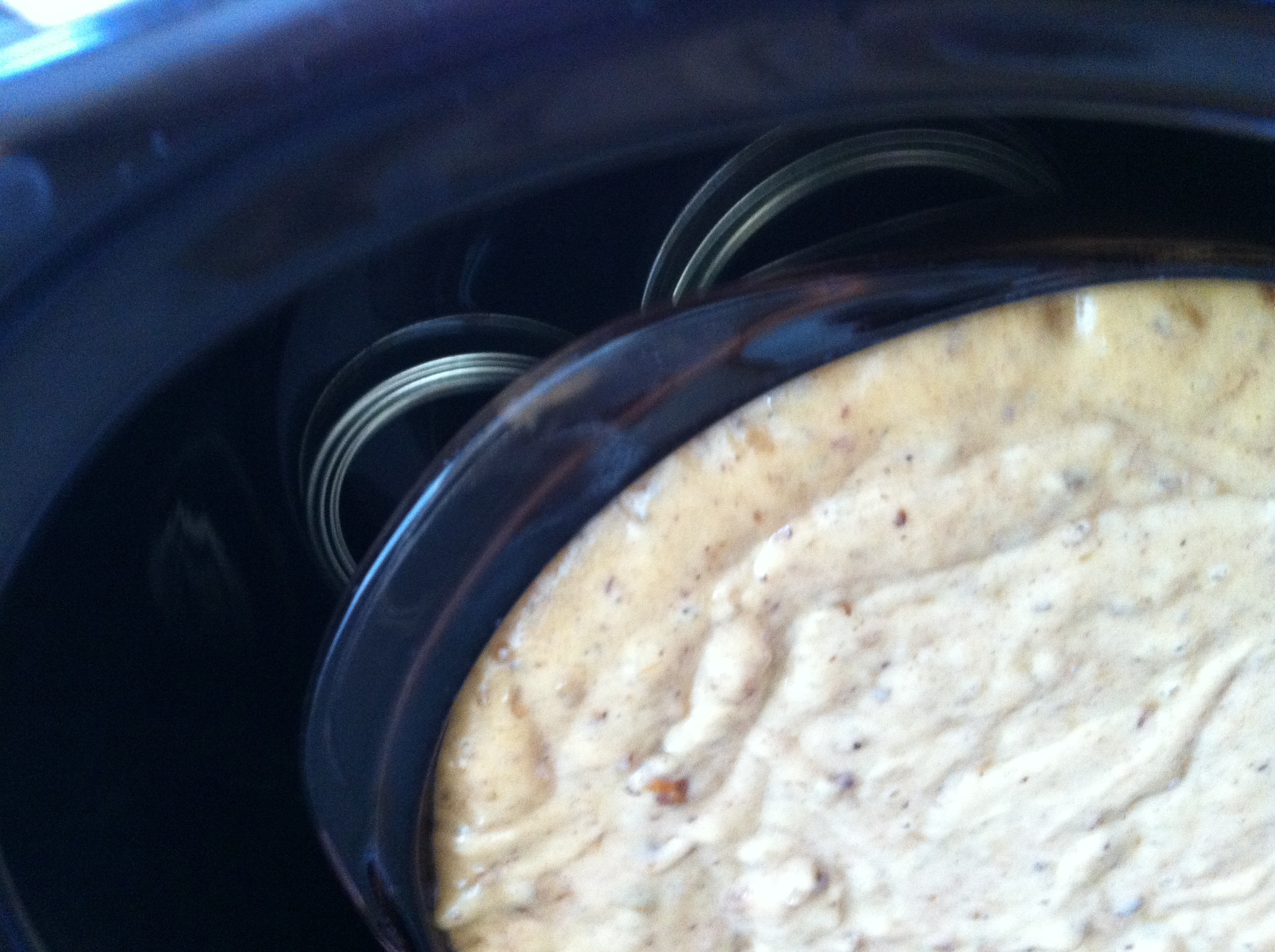 —If you're using the exciting crockpot, place a trivet or several canning lid rings in the bottom of your crockpot. Pour in 1 cup of water. Find a glass or metal pan or bowl that fits into your crockpot. Grease it. Pour the bread batter into the greased pan. Place the pan in the pot on top of the rings. Cover the crockpot and cook on high for 3-4 hours. I think the exact time will depend upon your altitude. When I lived in Maryland and Indiana this bread cooked faster. Out here clear up in the stratosphere it takes longer. Insert a knife in the center to check for doneness.