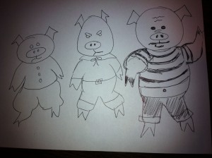 One day the three pigs decided they needed homes because the Big Bad Wolf was looking for food. And his favorite food was pig soup, and pork chops, and sausage, and ham, and hotdogs, and pancakes with eggs and syrup and bacon. He was REALLY HUNGRY to eat pig.